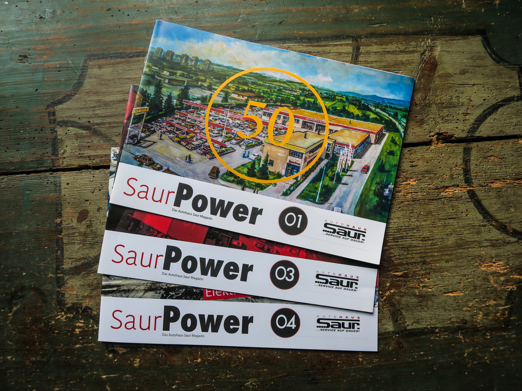 Zum 50. Jubiläum wünschte sich das Ulmer Autohaus Saur in der Blaubeurer Straße ein eigenes Kundenmagazin. Voilà: "SaurPower" war geboren, ein 24-seitiges Journal. Die erste Ausgabe widmete sich einer Retrospektive, um die letzten 50 Jahre Revue passieren zu lassen. Aufgrund des großen Erfolgs des Jubiläumsexemplars folgten schnell weitere kraftvolle und themenreiche Ausgaben.